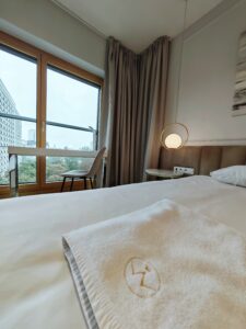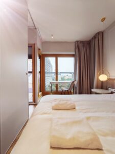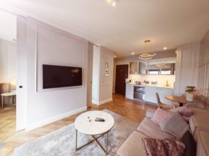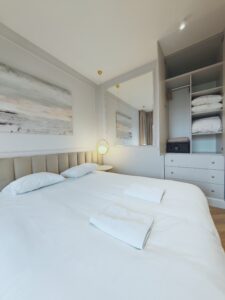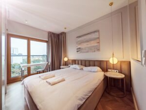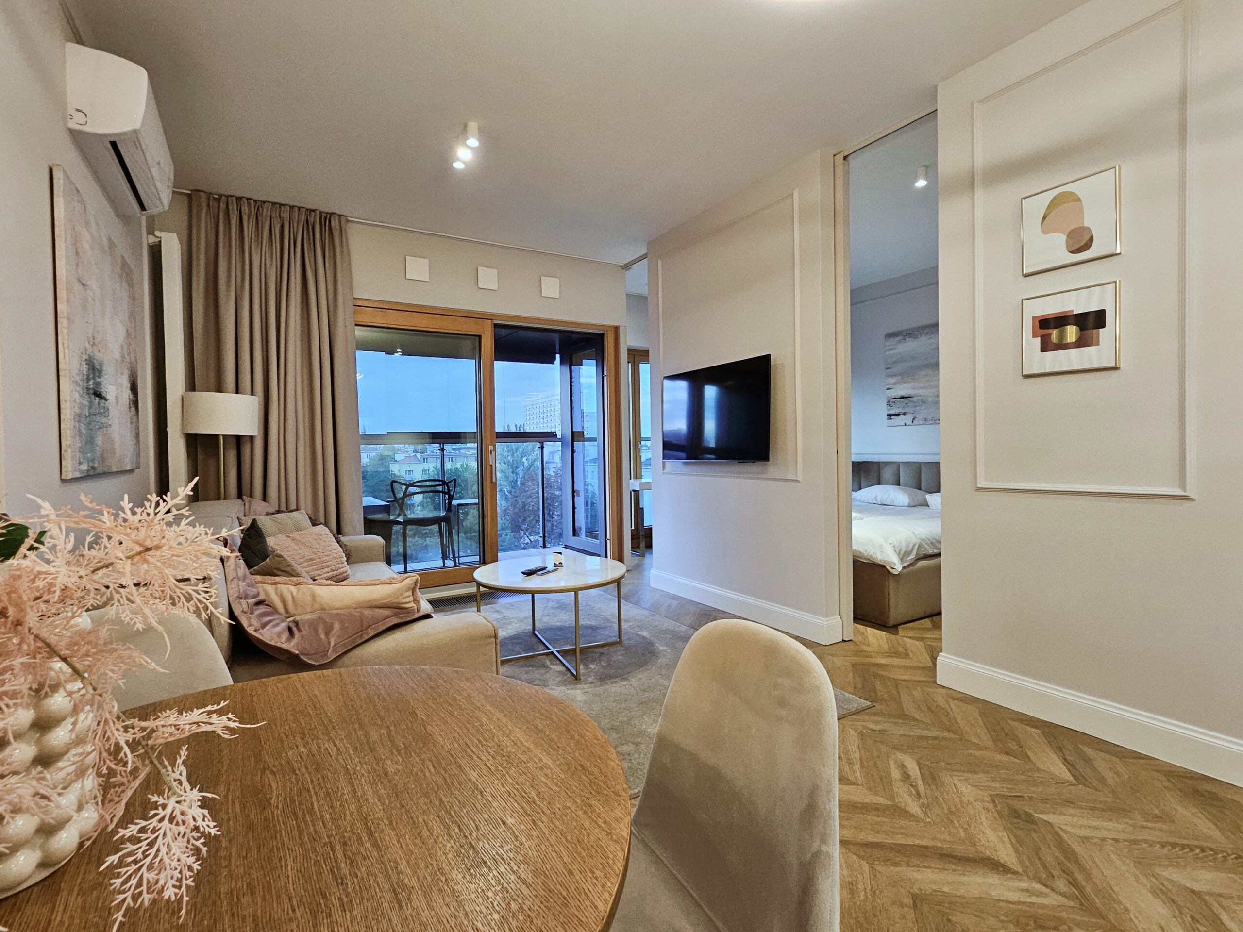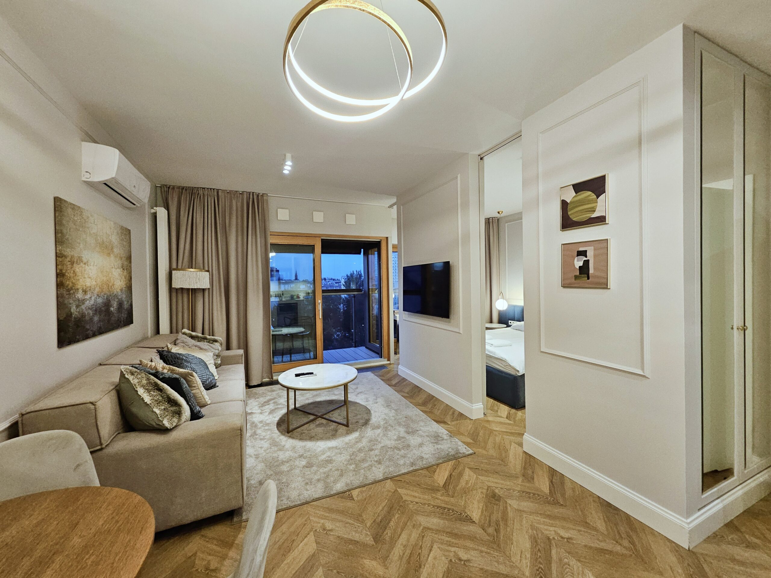 Apartament urządzony jest z dbałością o detale, a komfortowa sypialnia pozwala w pełni zregenerować siły. Z balkonu rozciąga się widok na tętniące życiem miasto, dzięki czemu można poczuć jego wyjątkową atmosferę.