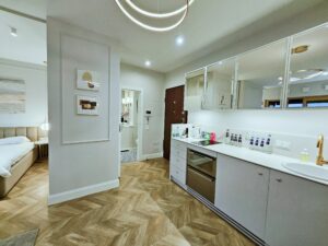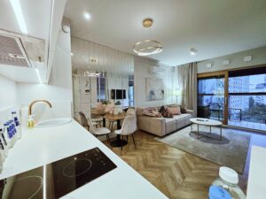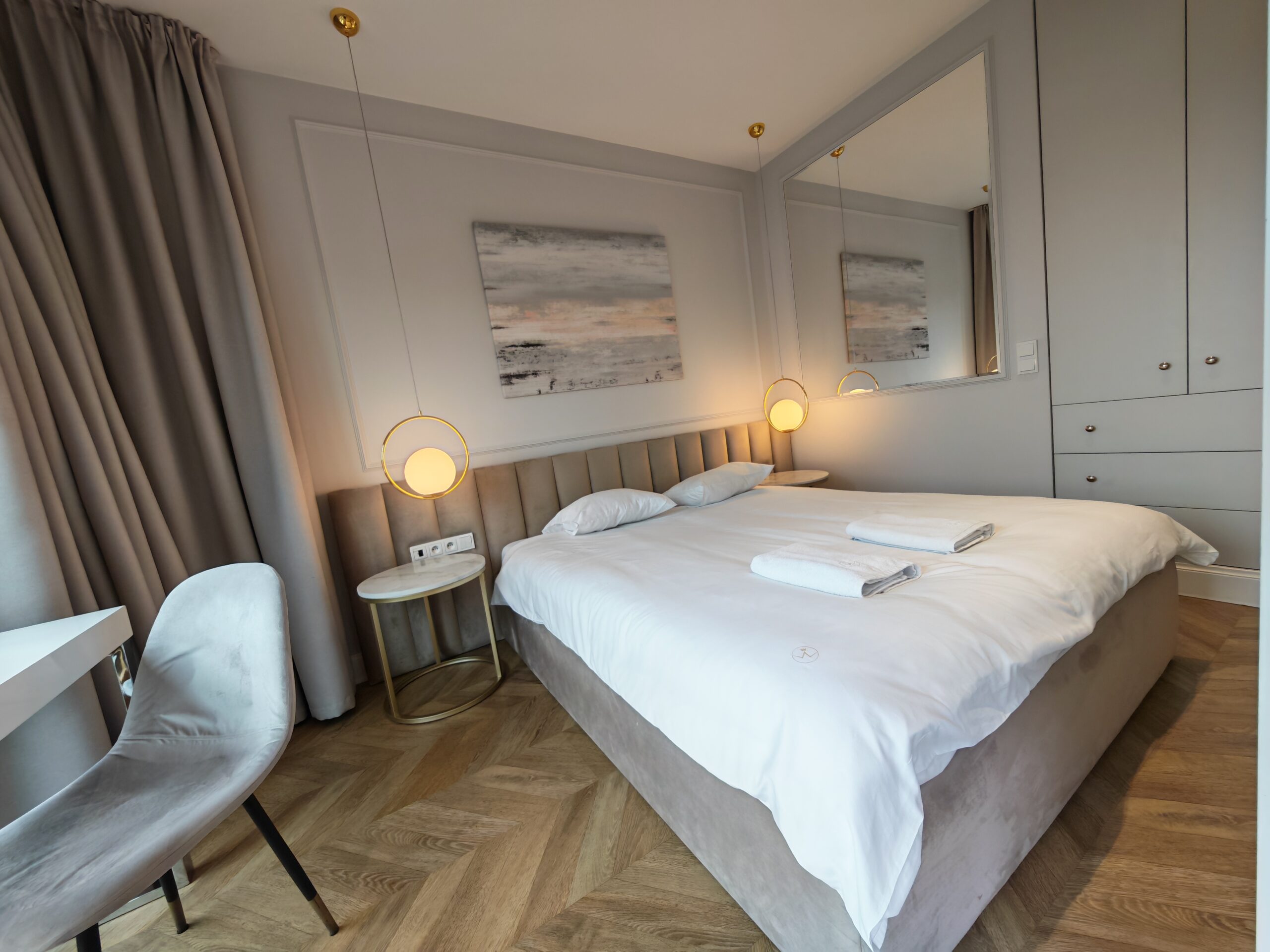 Goście mają do dyspozycji elegancką łazienkę z prysznicem i dużym lustrem, a na ich powitanie czekać będą starannie przygotowane zestawy startowe. W przestronnym salonie znajduje się część wypoczynkowa sprzyjająca relaksowi, a także w pełni wyposażony aneks kuchenny z minibarem, idealny na poranną kawę lub wieczorne spotkanie.