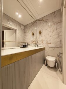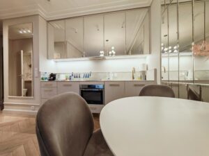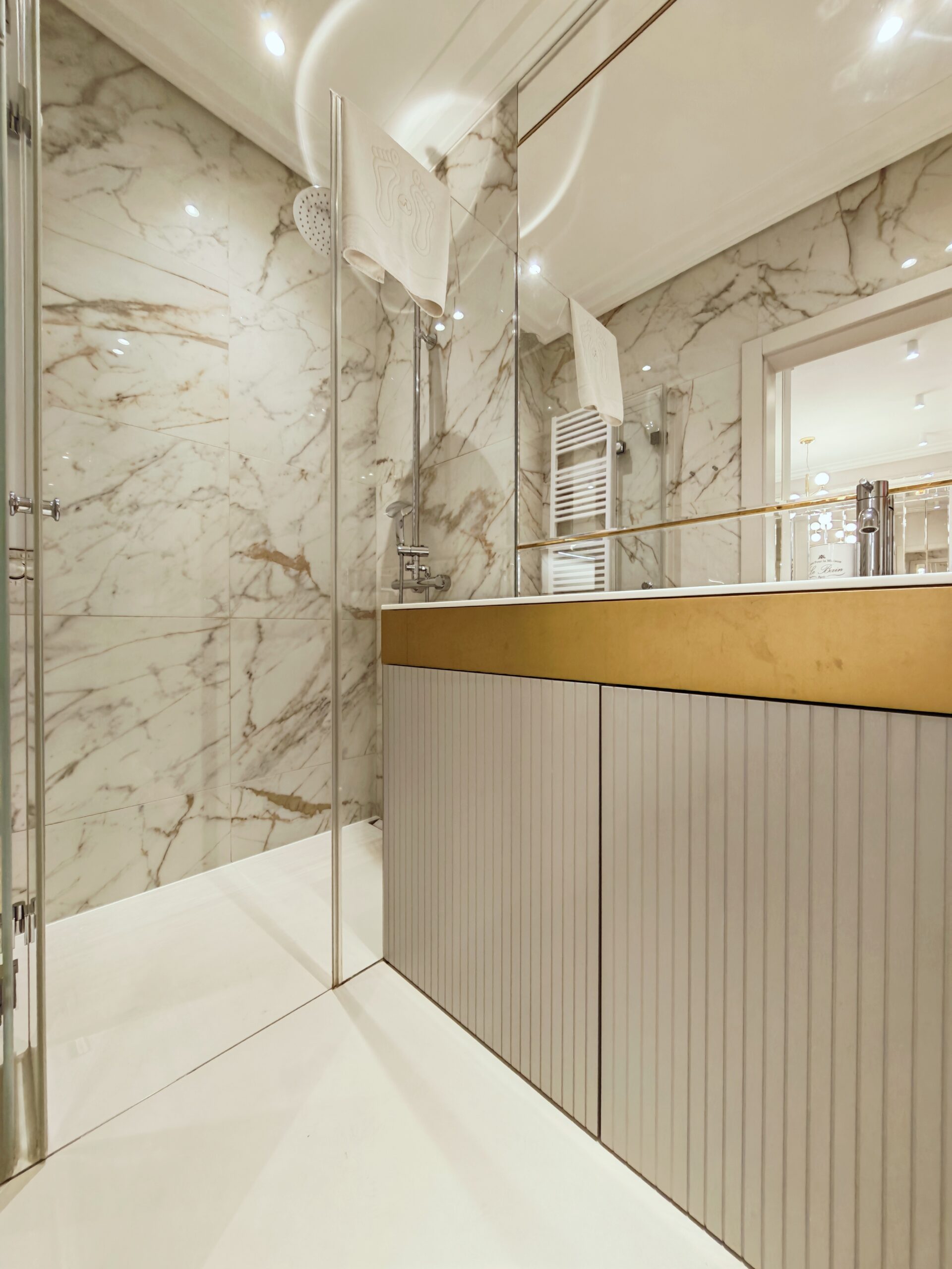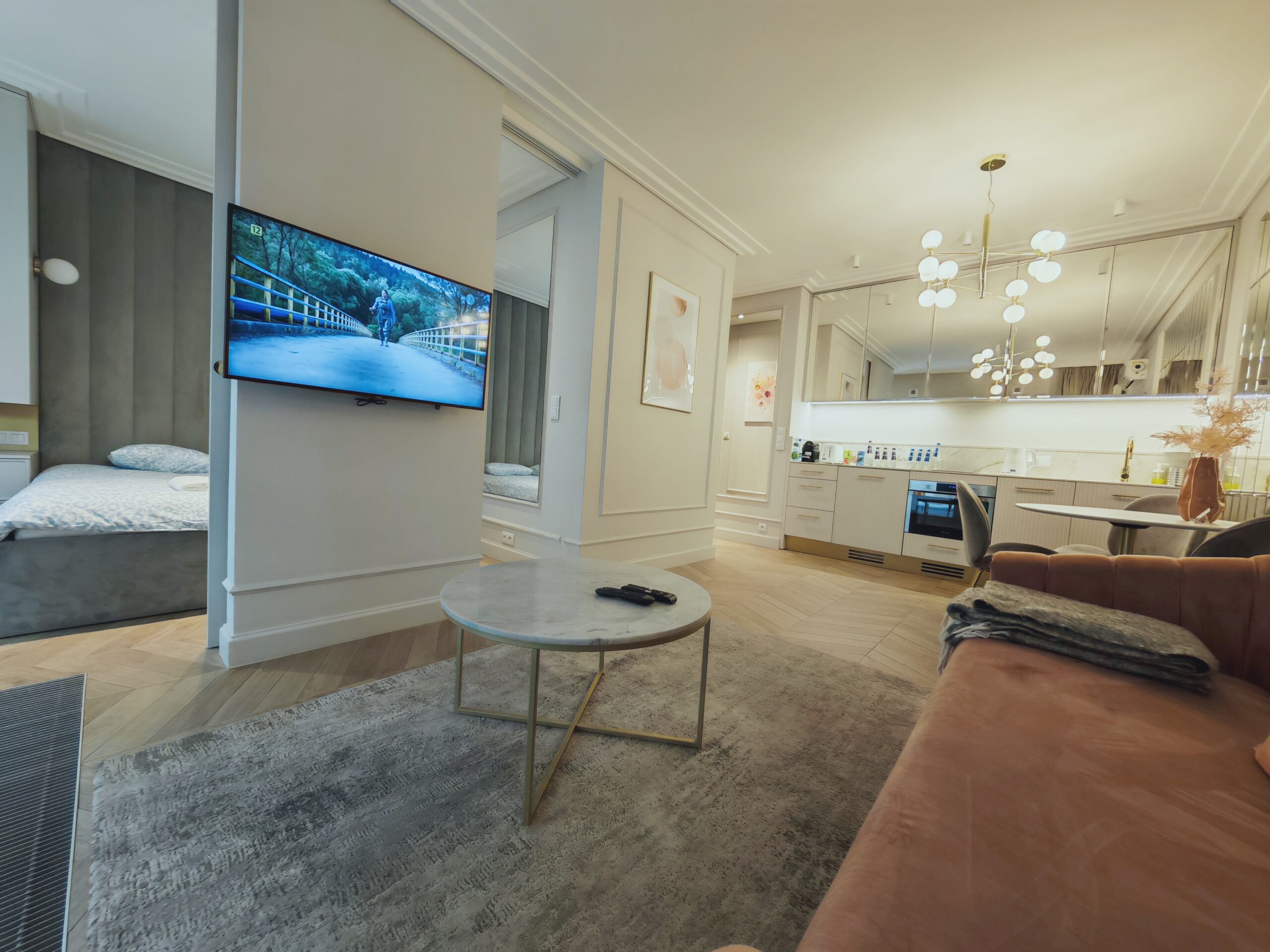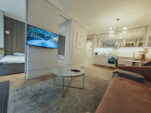 Goście mają do dyspozycji elegancką łazienkę z prysznicem i dużym lustrem, a na ich powitanie czekać będą starannie przygotowane zestawy startowe. W przestronnym salonie znajduje się część wypoczynkowa sprzyjająca relaksowi, a także w pełni wyposażony aneks kuchenny z minibarem, idealny na poranną kawę lub wieczorne spotkanie.