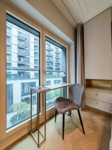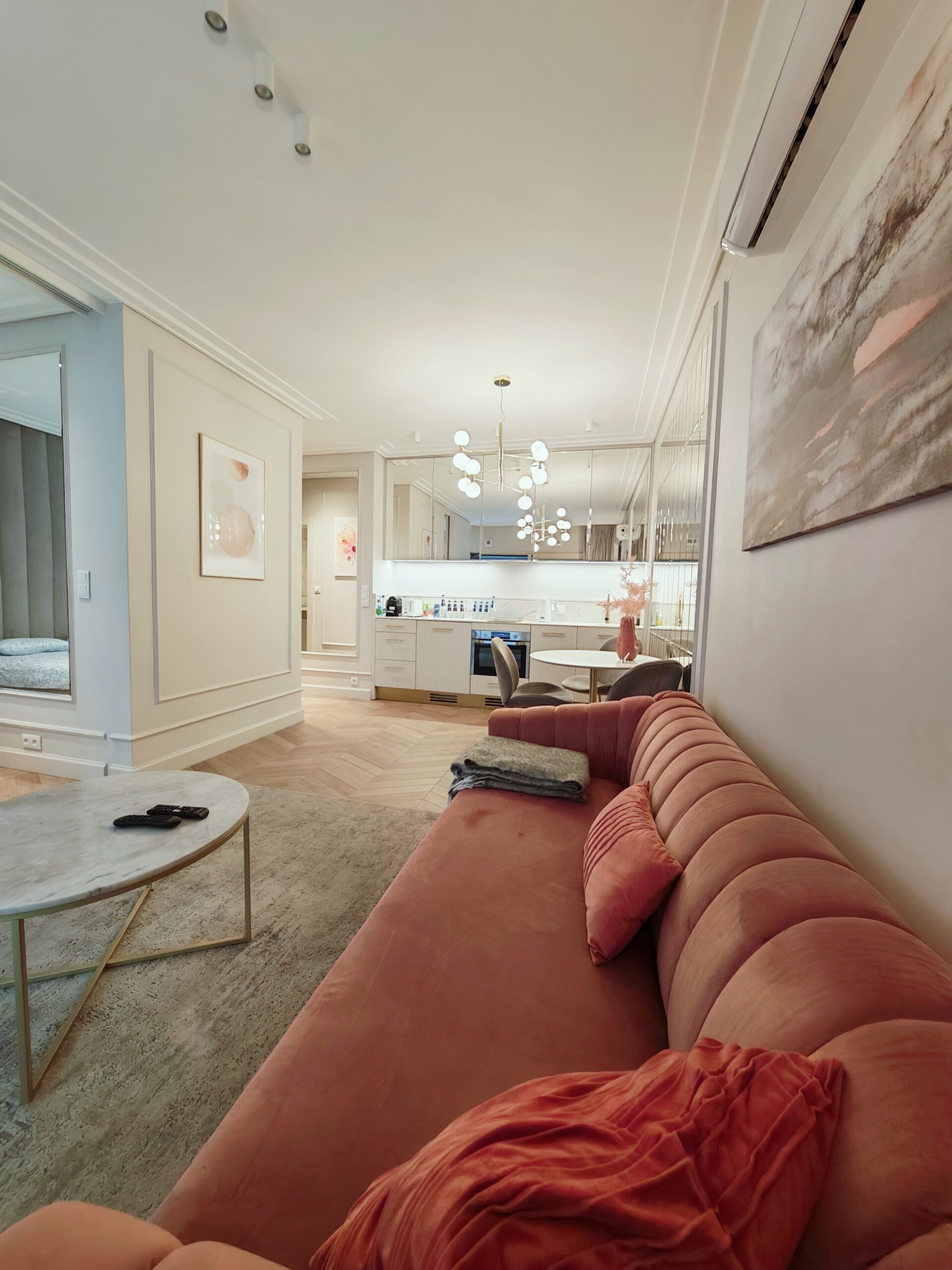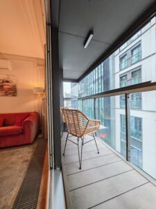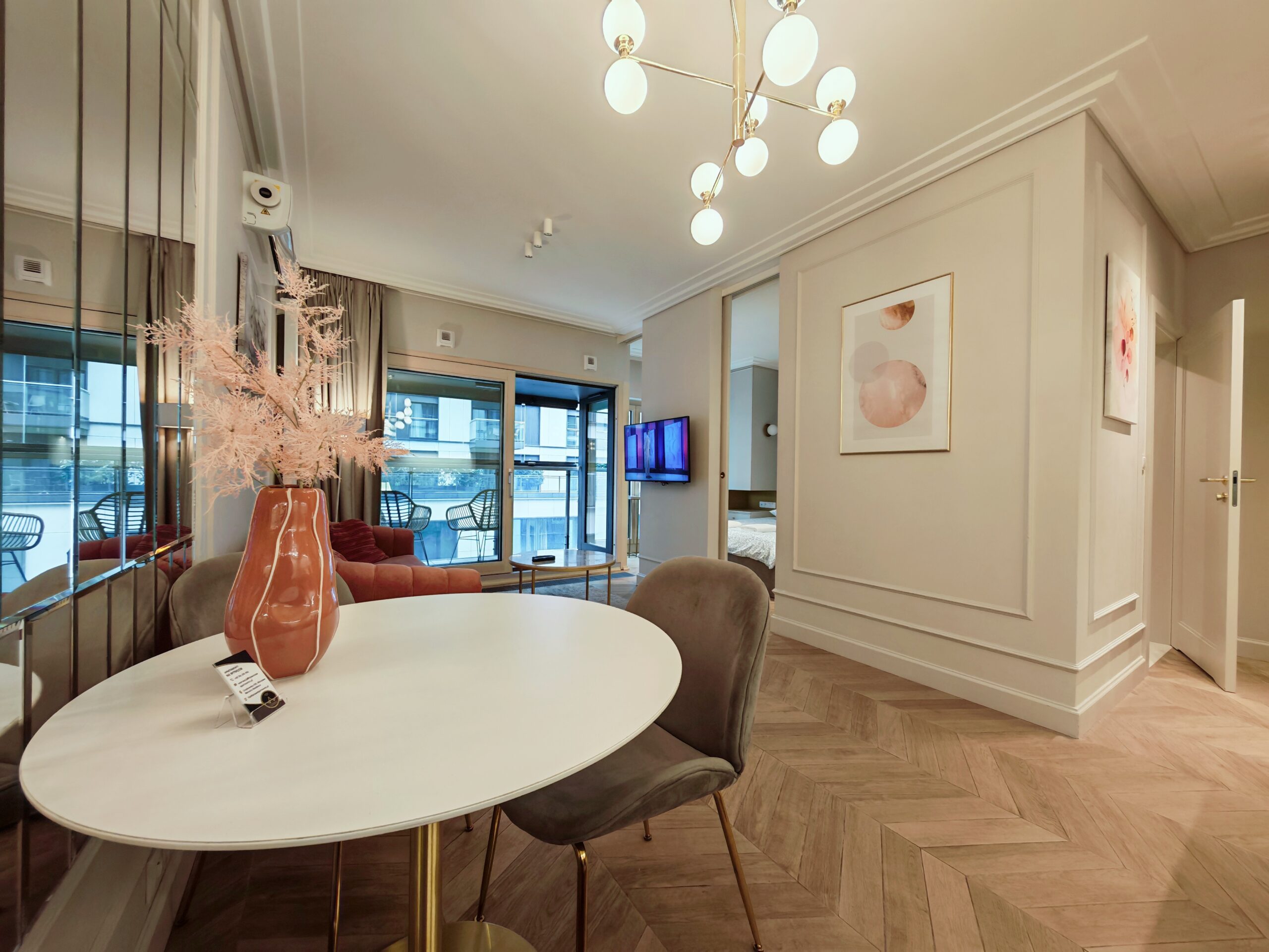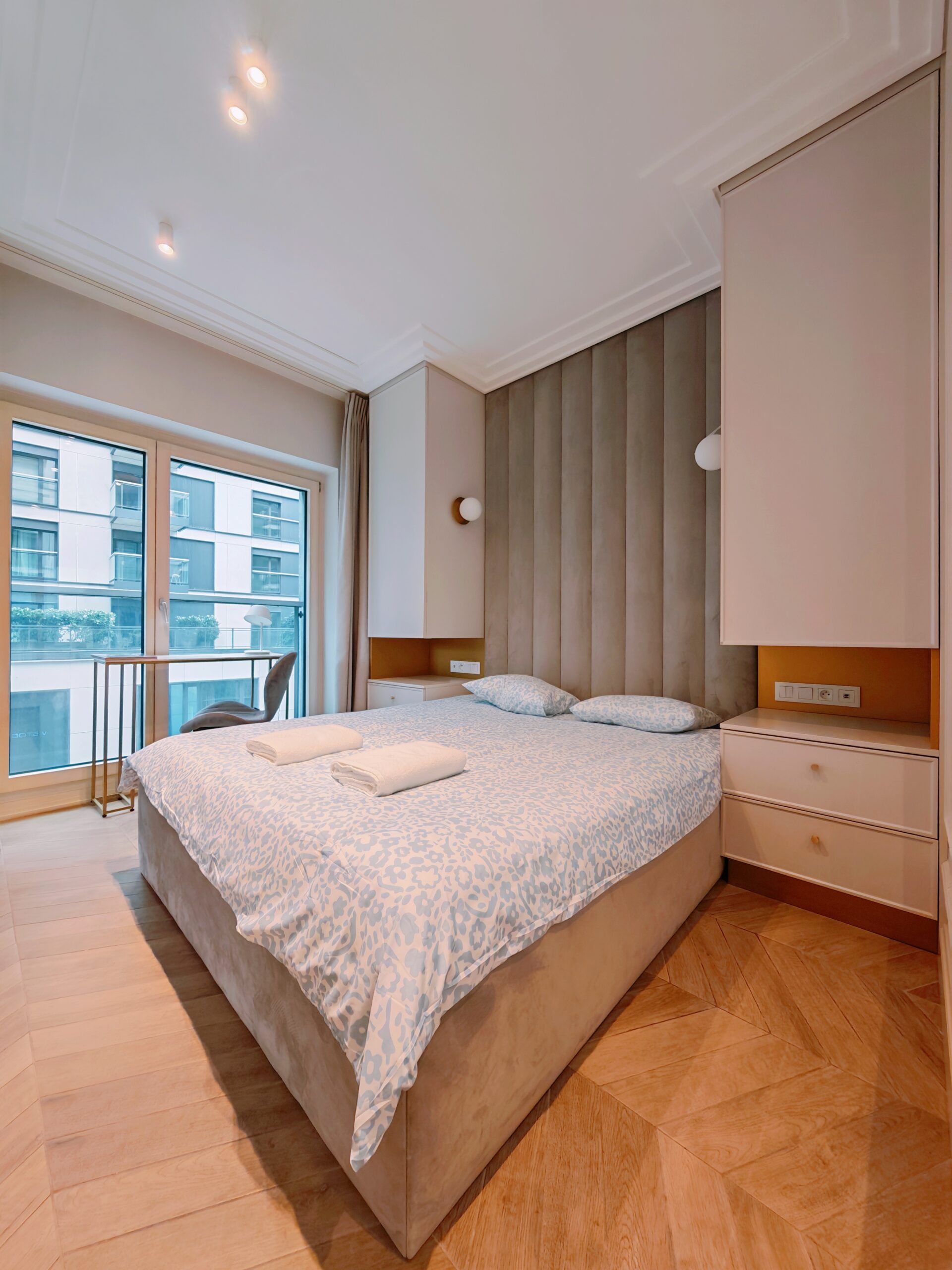 Apartament urządzony jest z dbałością o detale, a komfortowa sypialnia pozwala w pełni zregenerować siły. Z balkonu rozciąga się widok na tętniące życiem miasto, dzięki czemu można poczuć jego wyjątkową atmosferę.
