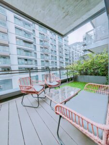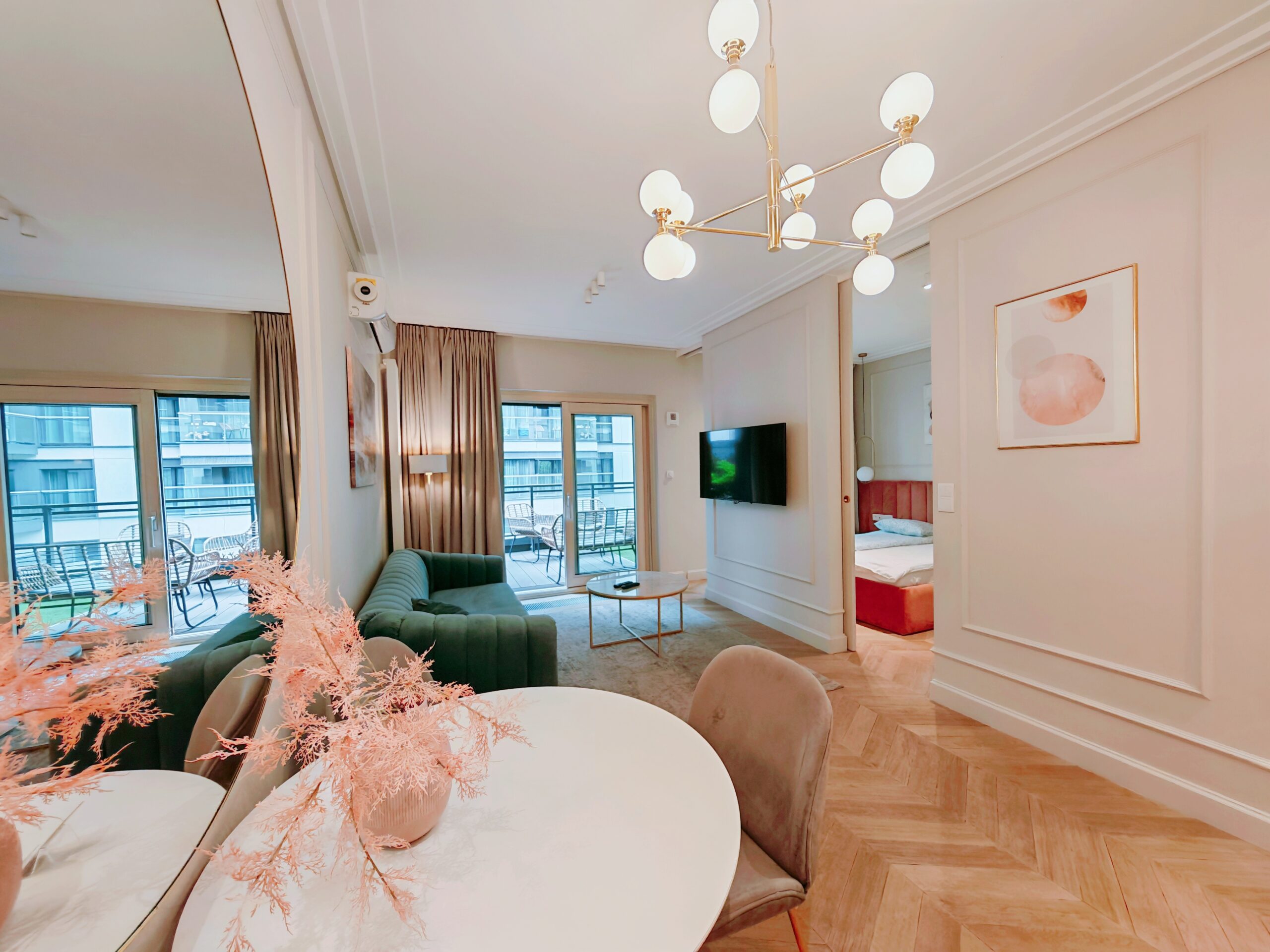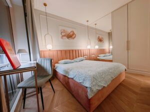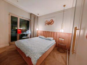 Apartament urządzony jest z dbałością o detale, a komfortowa sypialnia pozwala w pełni zregenerować siły. Z balkonu rozciąga się widok na tętniące życiem miasto, dzięki czemu można poczuć jego wyjątkową atmosferę.