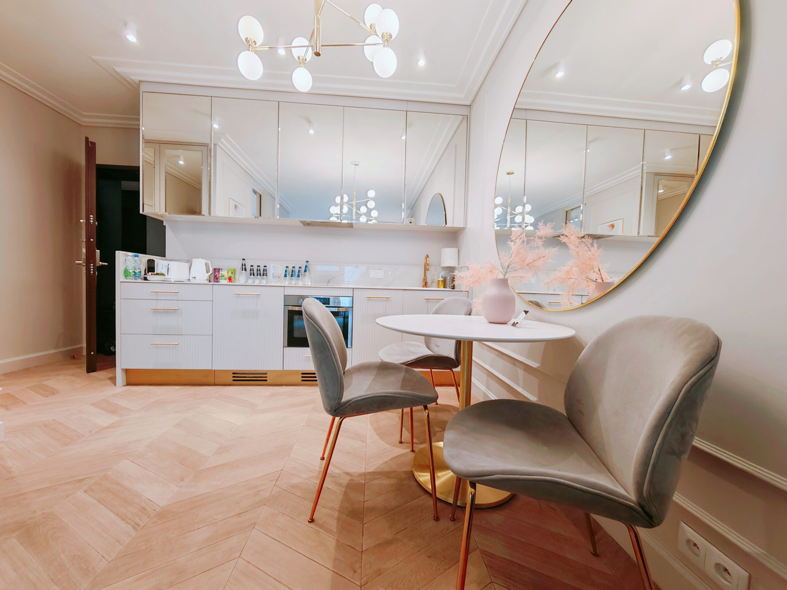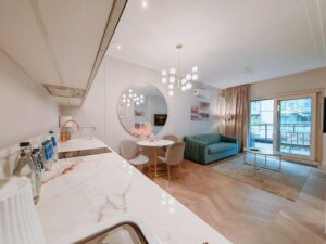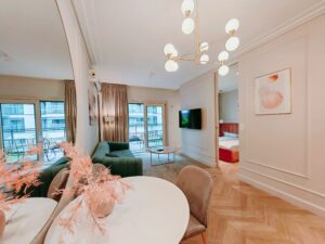 Goście mają do dyspozycji elegancką łazienkę z prysznicem i dużym lustrem, a na ich powitanie czekać będą starannie przygotowane zestawy startowe. W przestronnym salonie znajduje się część wypoczynkowa sprzyjająca relaksowi, a także w pełni wyposażony aneks kuchenny z minibarem, idealny na poranną kawę lub wieczorne spotkanie.